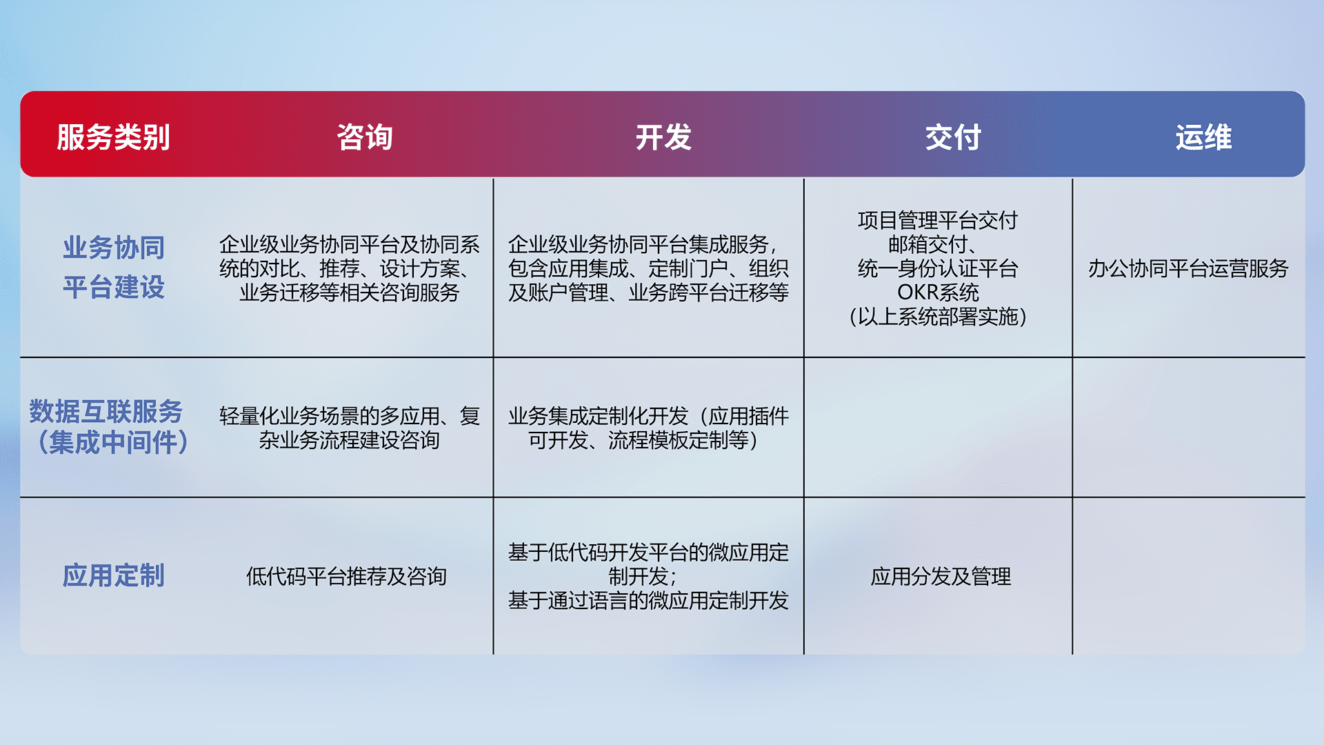 针对钉钉、、企微、、、IDaas等平台级产品提供产品的规划、、、方案、、、、交付、、、、定制化开发等服务,,实现如统一协同办公、、、、智能客户服务、、、混合会议管理、、智能数据查询、、等业务场景,,,实现数字化转型。。